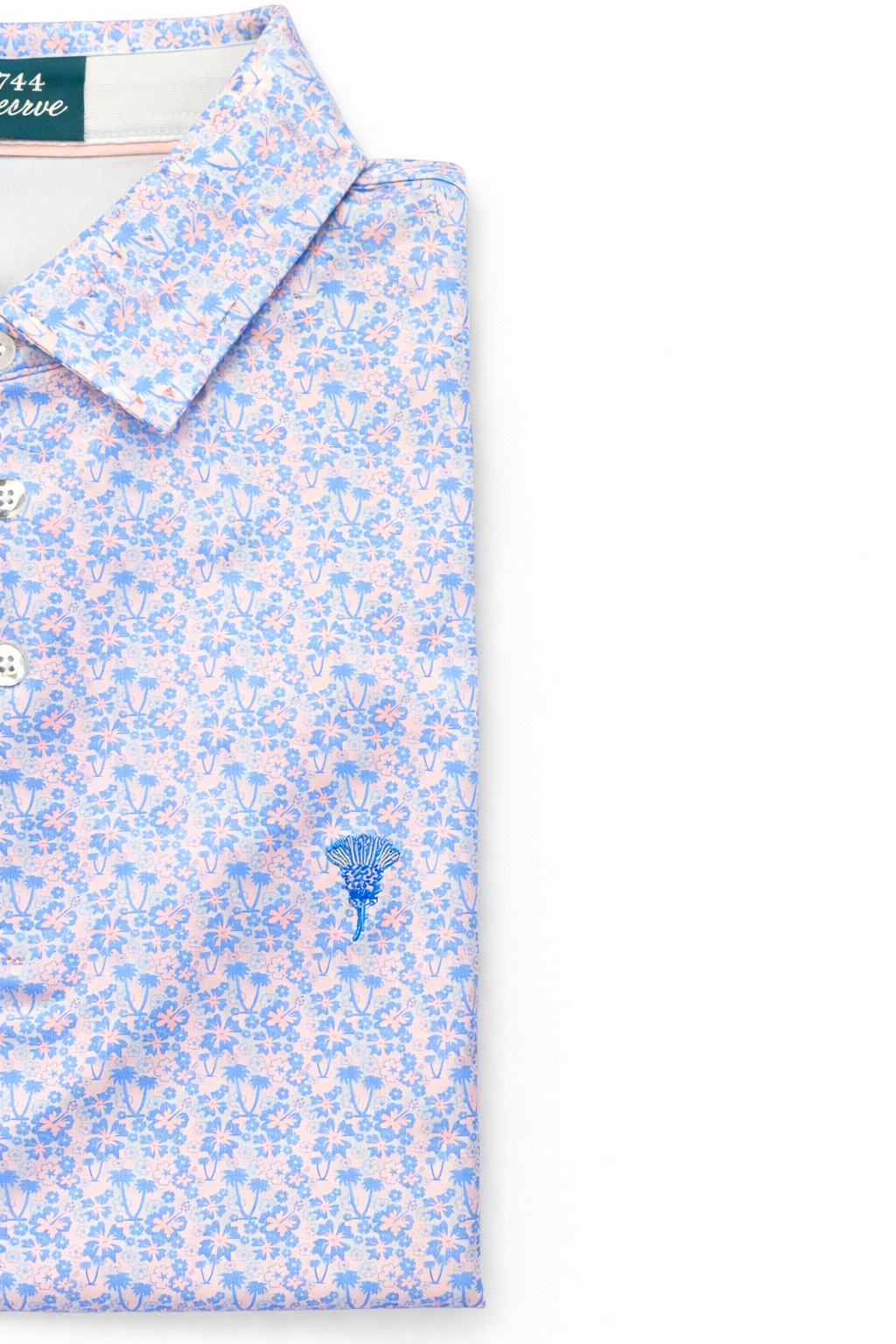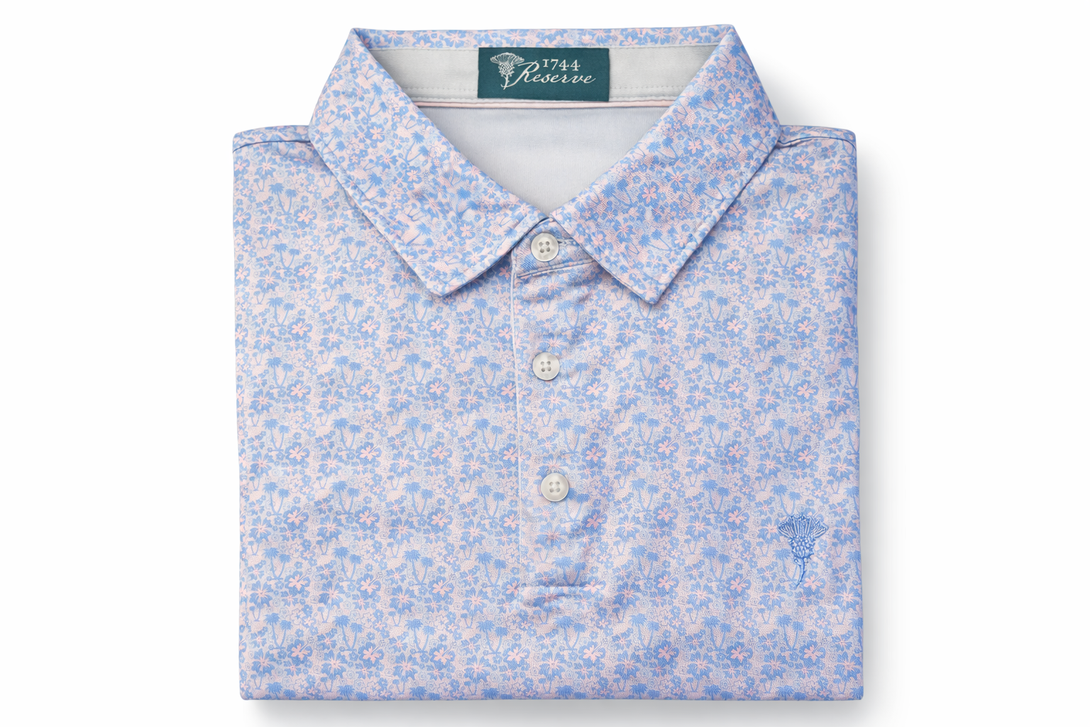 A soft sky-blue foundation is layered with a delicate floral pattern—subtle, intentional, and quietly expressive—echoing the wild blooms that line the links of the Lowlands. Finished with our signature embroidered thistle, this polo honors resilience, tradition, and the understated confidence of those who know the game’s history and its future.